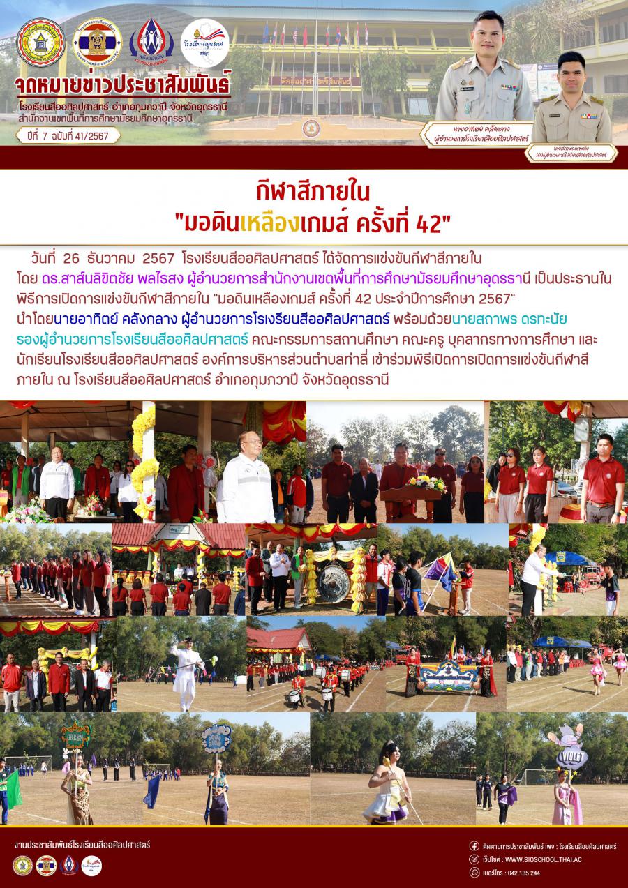 โดย ดร.สาส์นลิขิตชัย พลไธสง ผู้อำนวยการสำนักงานเขตพื้นที่การศึกษามัธยมศึกษาอุดรธานี เป็นประธานในพิธีการเปิดการแข่งขันกีฬาสีภายใน “มอดินเหลืองเกมส์ ครั้งที่ 42 ประจำปีการศึกษา 2567”