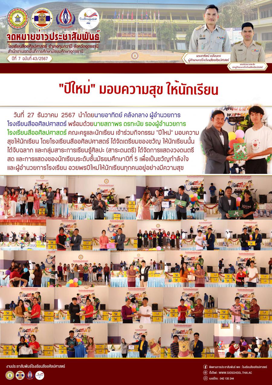 วันที่ 27 ธันวาคม 2567 นำโดยนายอาทิตย์ คลังกลาง ผู้อำนวยการโรงเรียนสีออศิลปศาสตร์ พร้อมด้วยนายสถาพร ดรทะนัย รองผู้อำนวยการโรงเรียนสีออศิลปศาสตร์ คณะครูและนักเรียน เข้าร่วมกิจกรรม “ปีใหม่” มอบความสุขให้นักเรียน โดยโรงเรียนสีออศิลปศาสตร์ ได้จัดเตรียมของขวัญ ให้นักเรียนนั้นได้จับฉลาก และกลุ่มสาระการเรียนรู้ศิลปะ (สาระดนตรี) ได้จัดการแสดงวงดนตรีสด และการแสดงของนักเรียนระดับชั้นมัธยมศึกษาปีที่ 5 เพื่อเป็นขวัญกำลังใจ และผู้อำนวยการโรงเรียน อวยพรปีใหม่ให้นักเรียนทุกคนอยู่อย่างมีความสุข